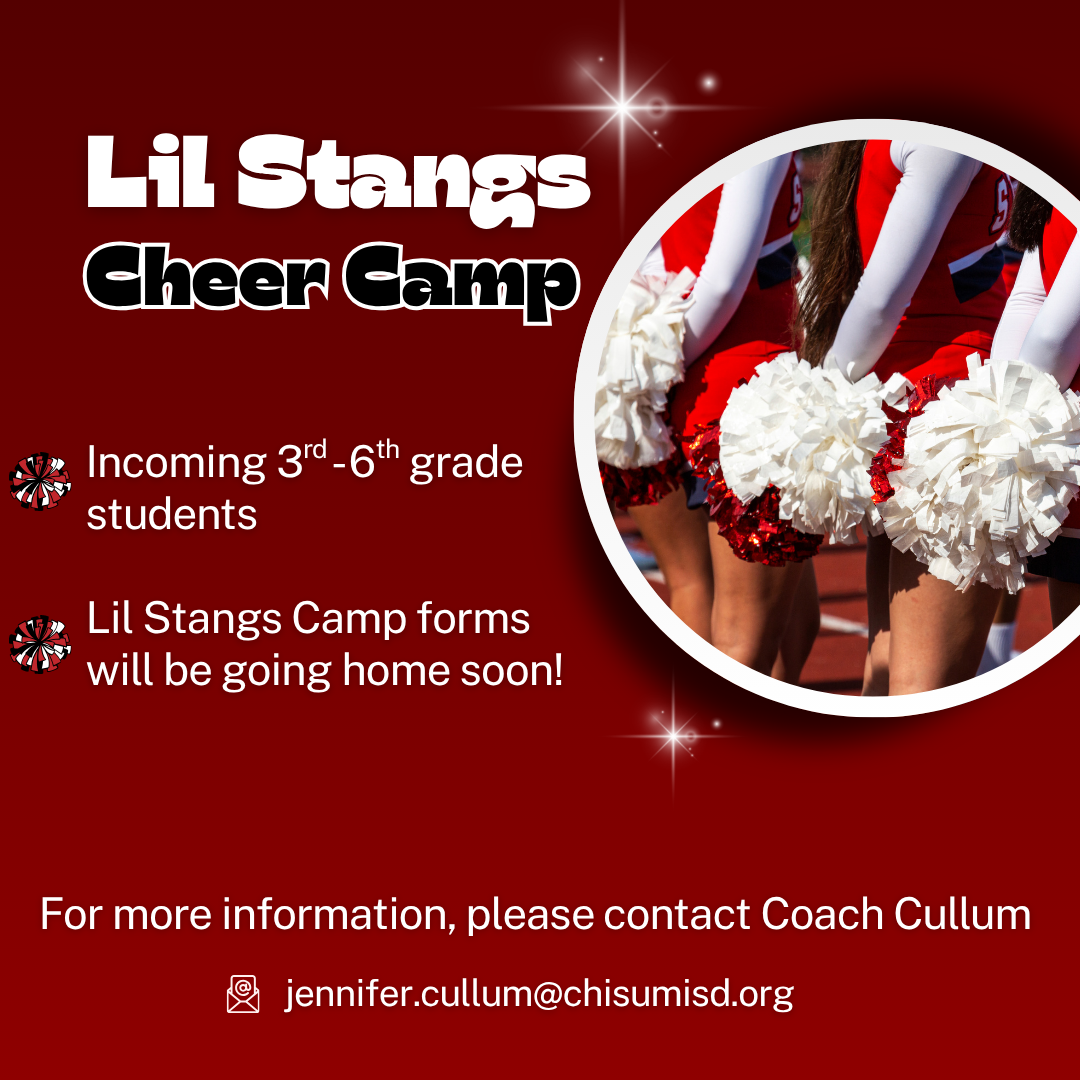 Attention all incoming 3rd - 6th grade students; Lil Stangs Camp forms will be going home soon! For more information, please contact Coach Cullum at: jennifer.cullum@chisumisd.org
